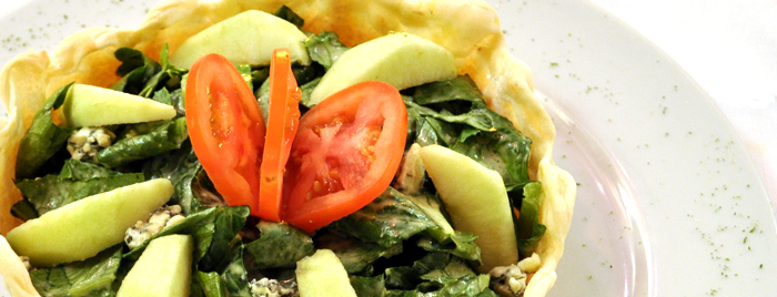 Manzana verde, queso gorgonzola, lechuga romana, hierbabuena.