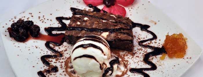 Deliciosa bizcocho de almendras y avena relleno de chocolate, servido con helado de vainilla y salsa de chocolate